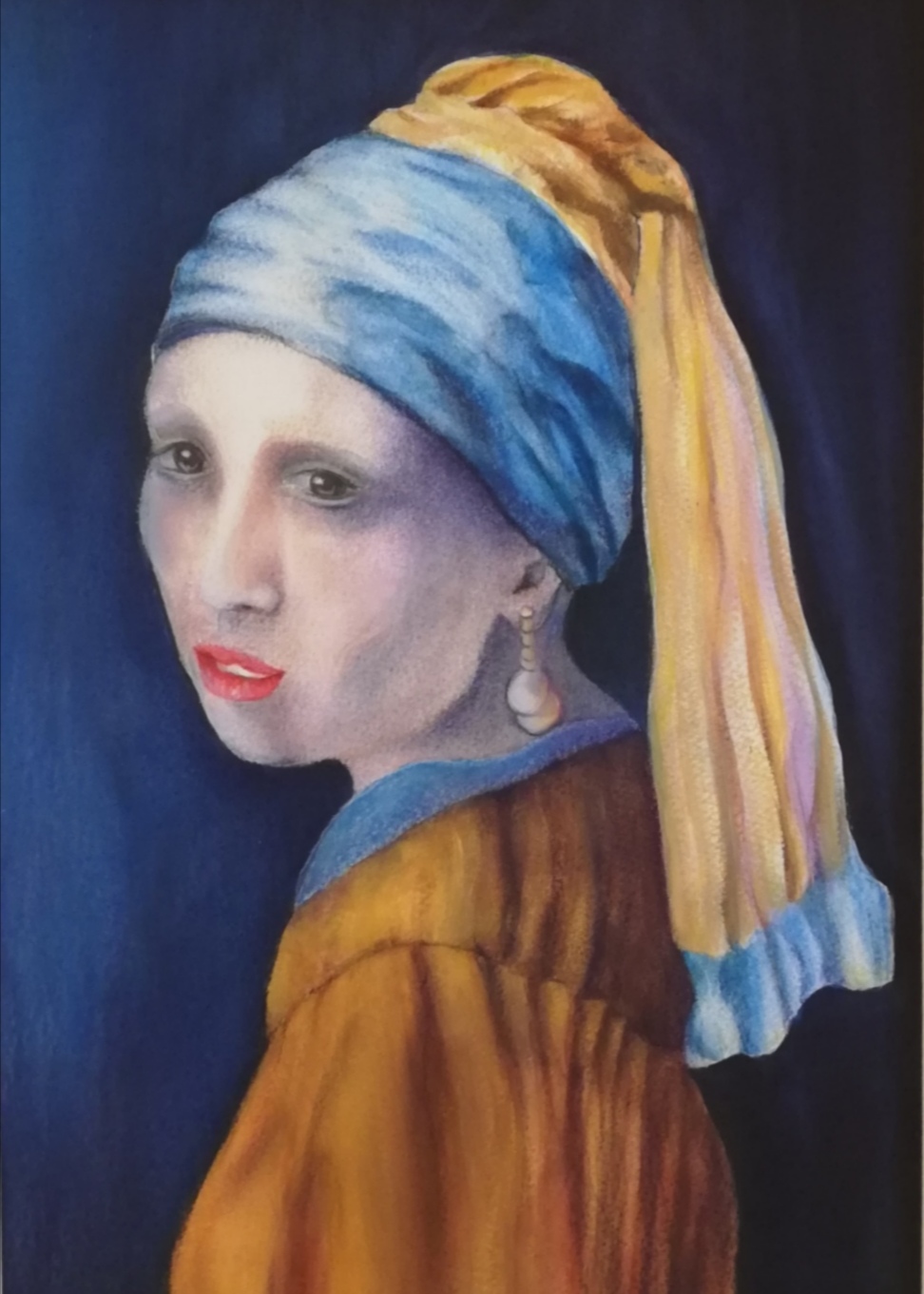 Paying homage to Veermeer original work 1665 Mixed media Size 28.5 x 41 cm Mounted 51 cm x 41 cm