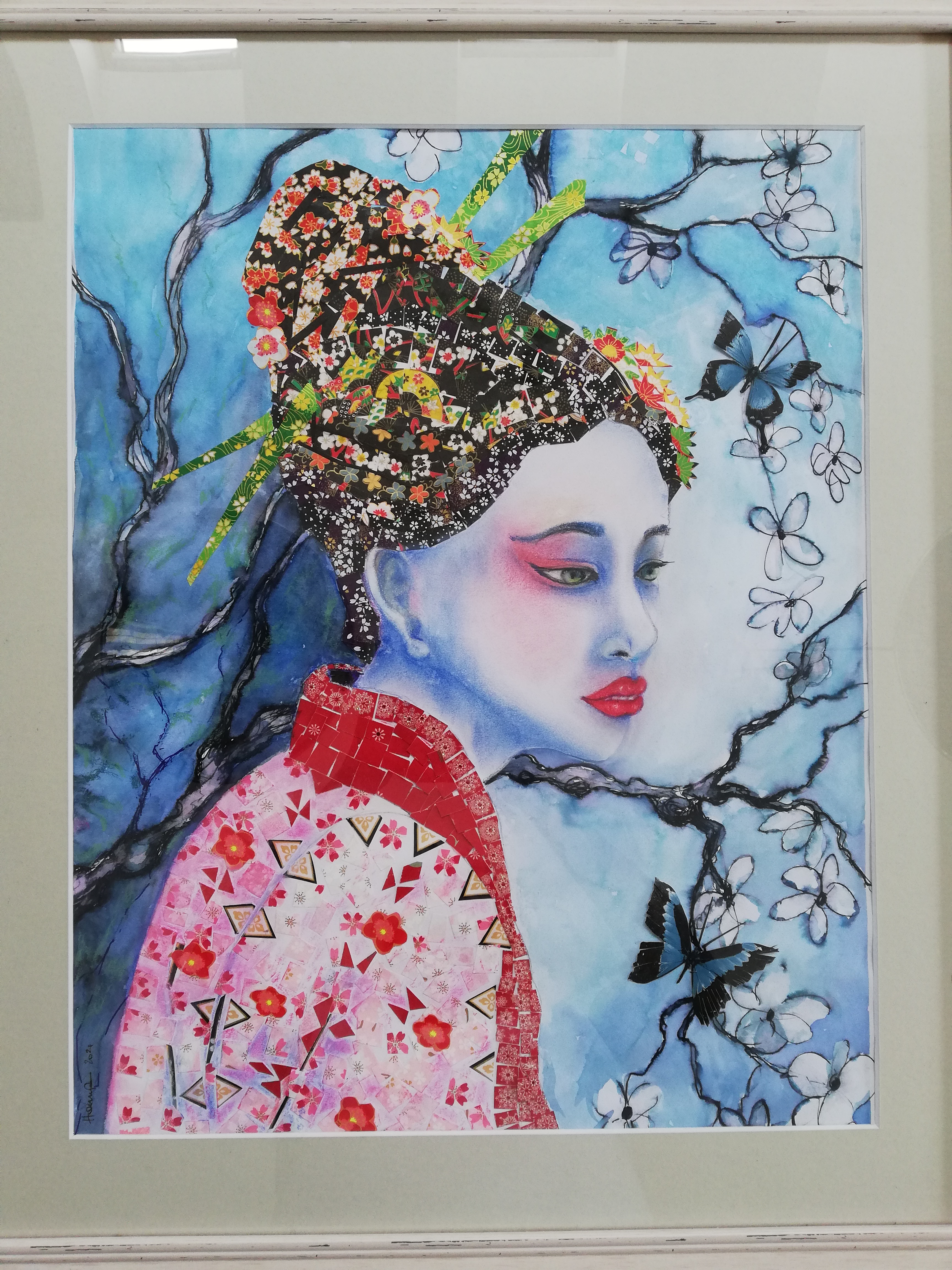 Original artwork. Mixed media collage of beautiful lady Ink, coloured pencils, watercolour, upcycled paper + pictures Size of artwork 40 x 50cm Mounted and framed. External frame size, 60 x 70 cm approximately