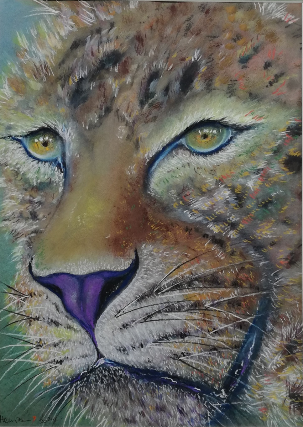 Watercolour of leopard. Pink nose, green blackground Size 28.5 x 41cm Mounted 41 x 51 cm