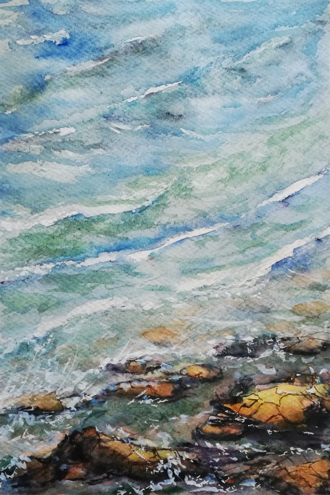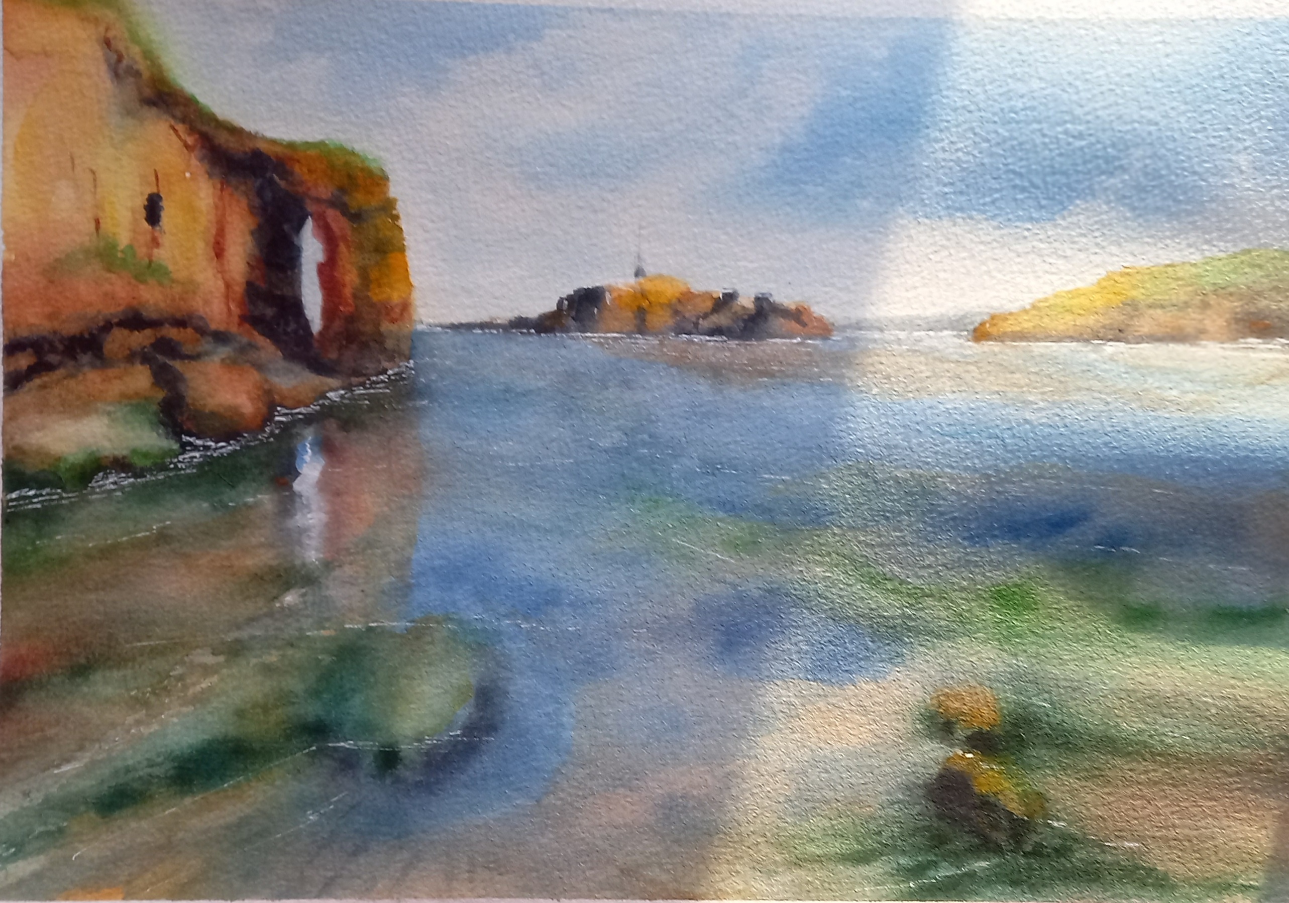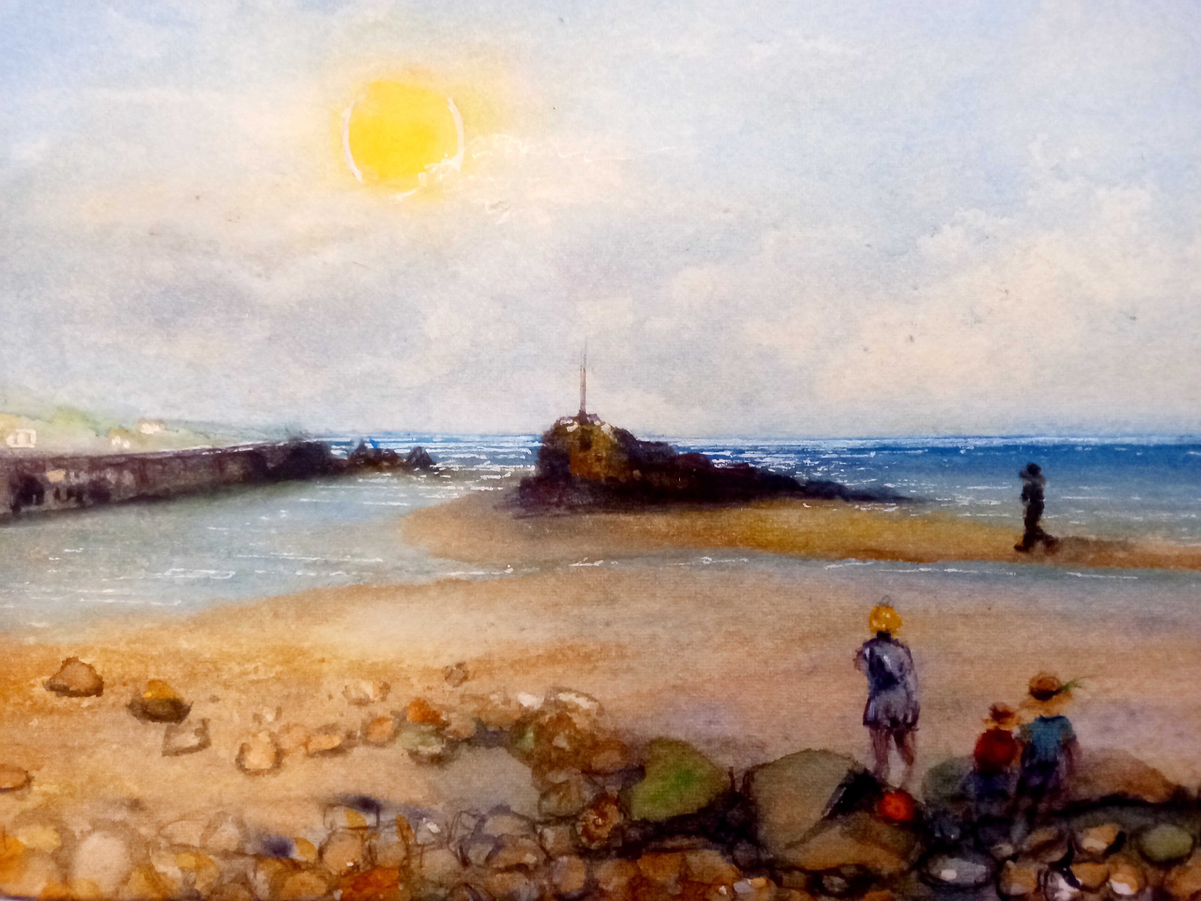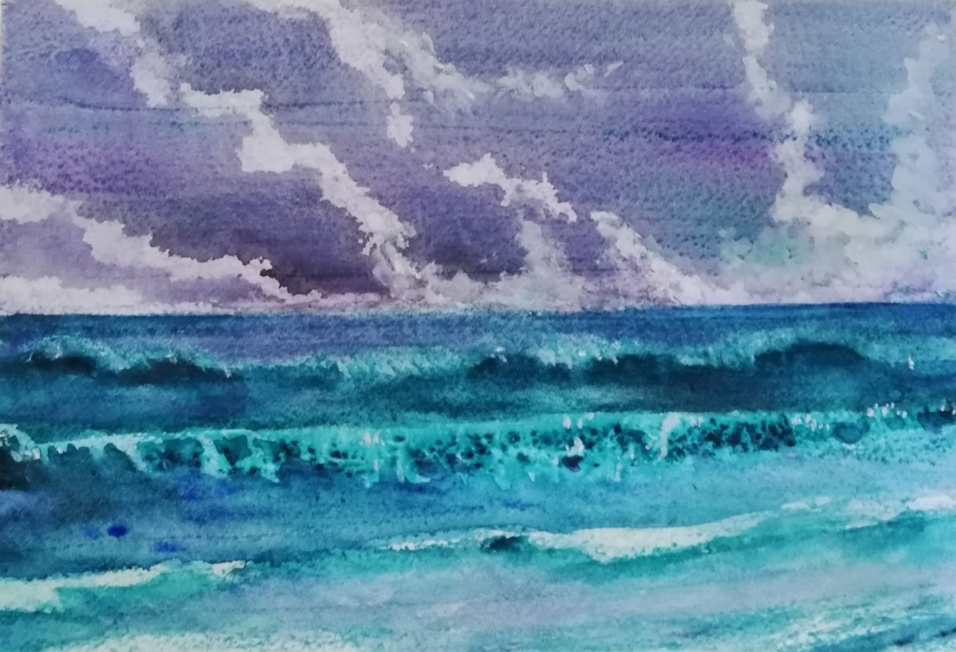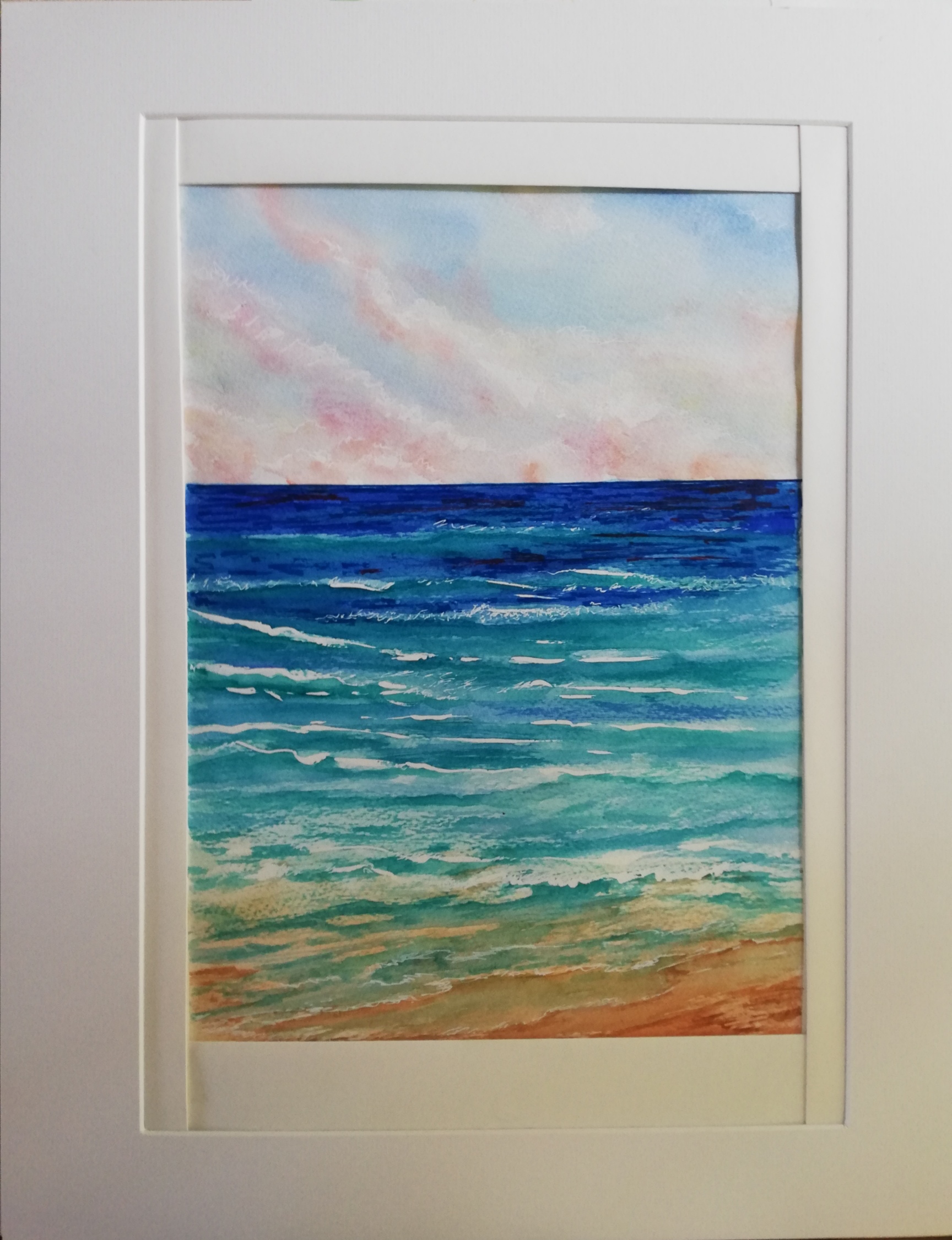 Sky, sea, sand and the hours just fly by, Whatever the weather, its majesty is spellbinding. Watercolour A4 Mounted