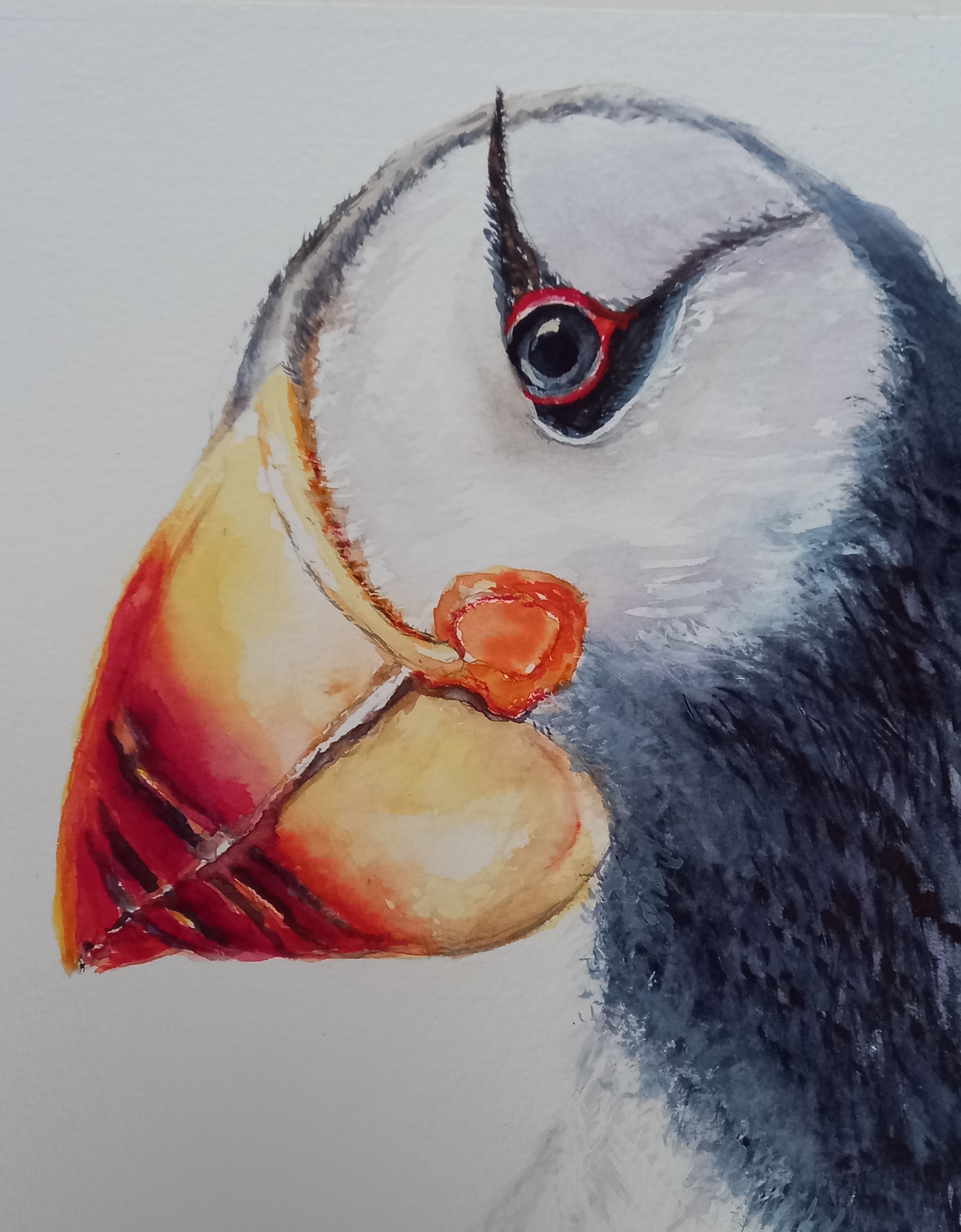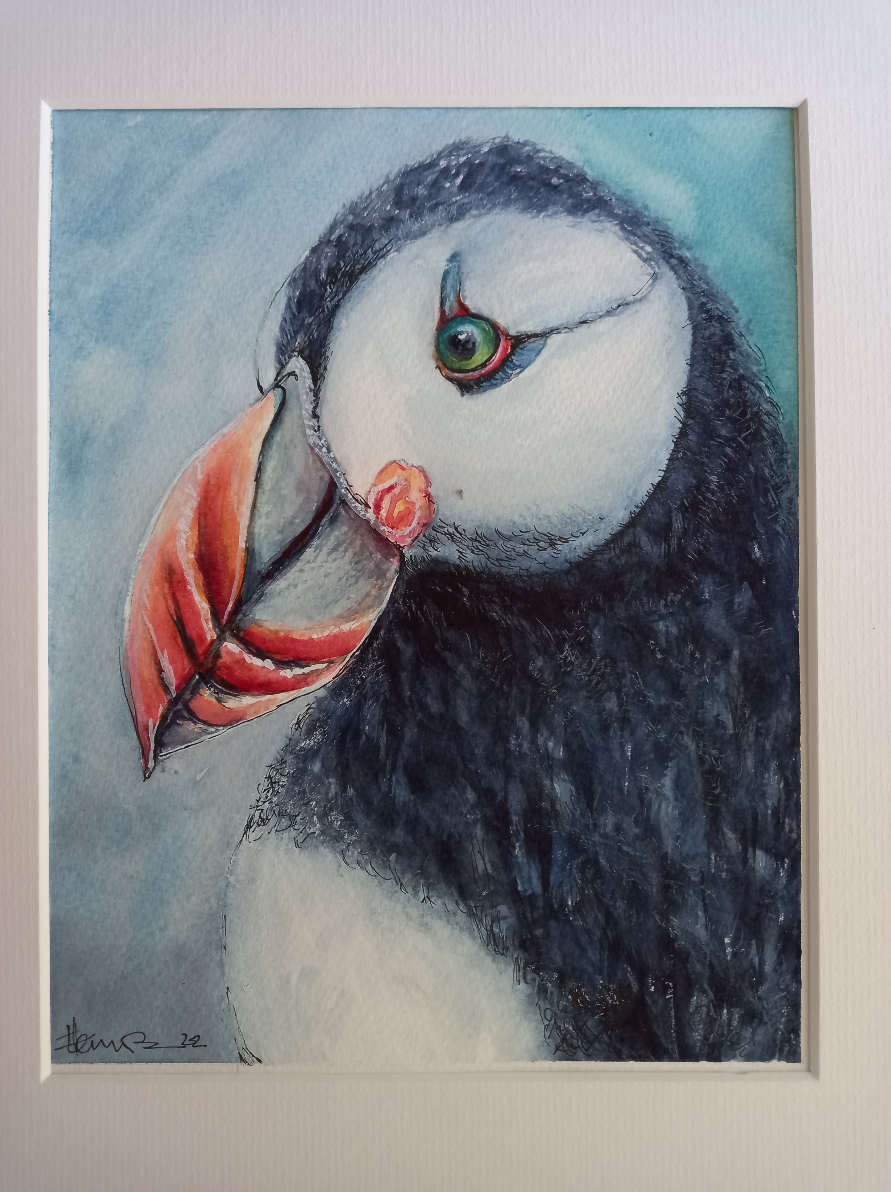 Watercolour Puffin. Celebrating Blue, White & Red. Vibrant watercolour of puffin. Size 17 x 22 cm Mounted 25 x 30cm
