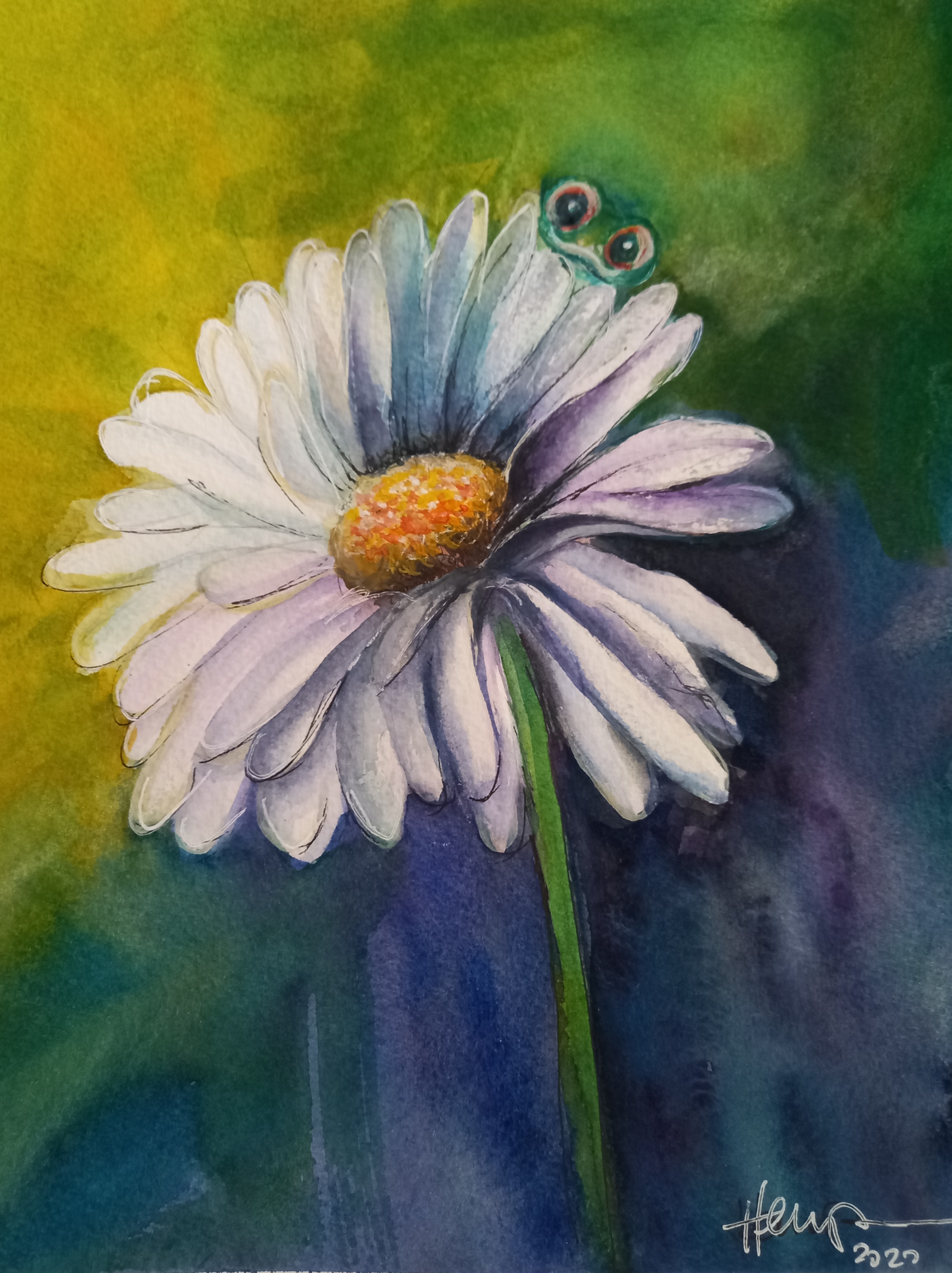 Vibrant watercolour of flower and frog Mounted Size 25cm x 30cm